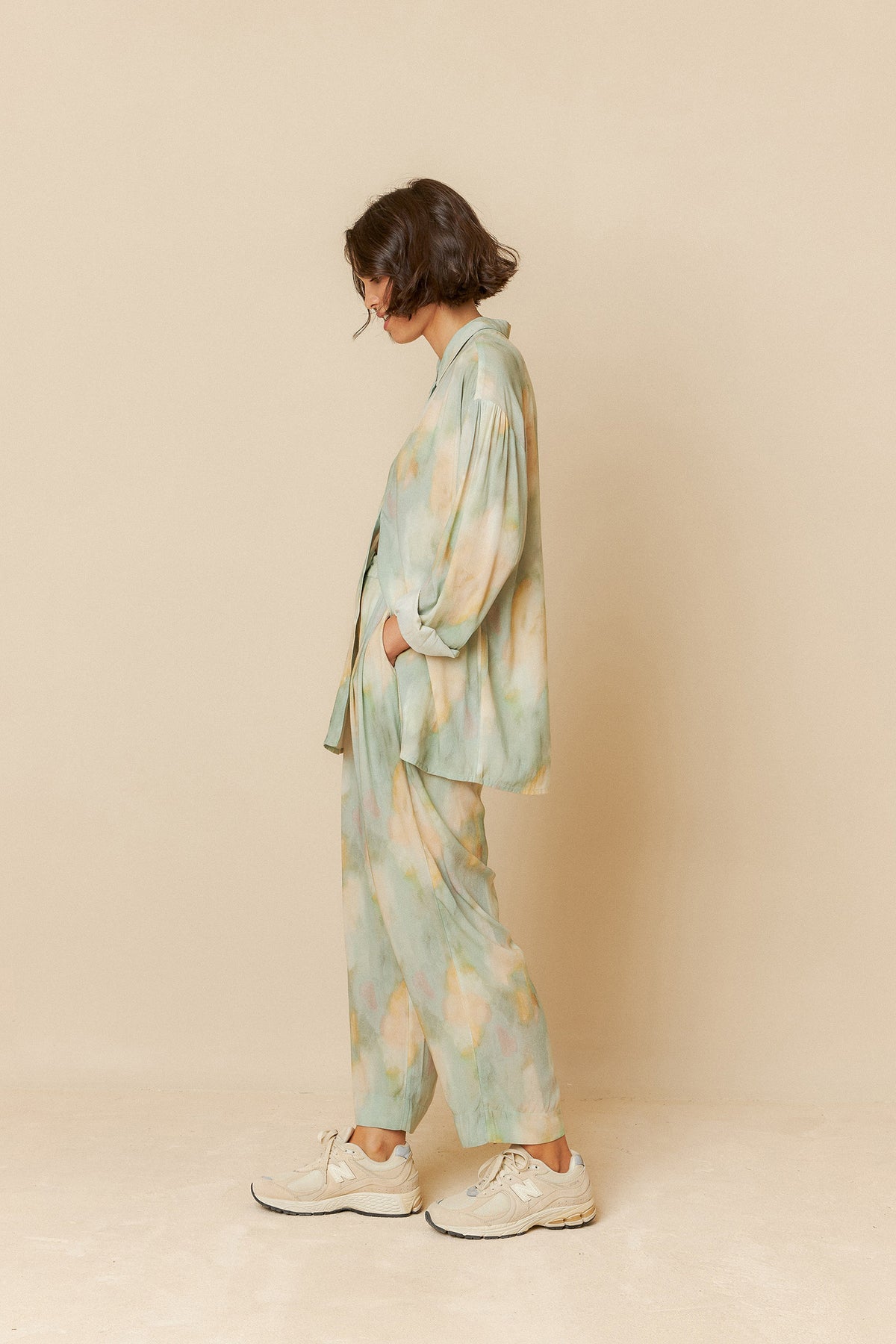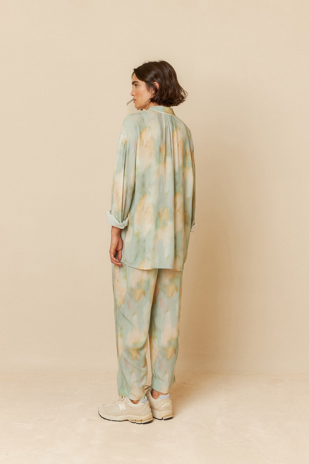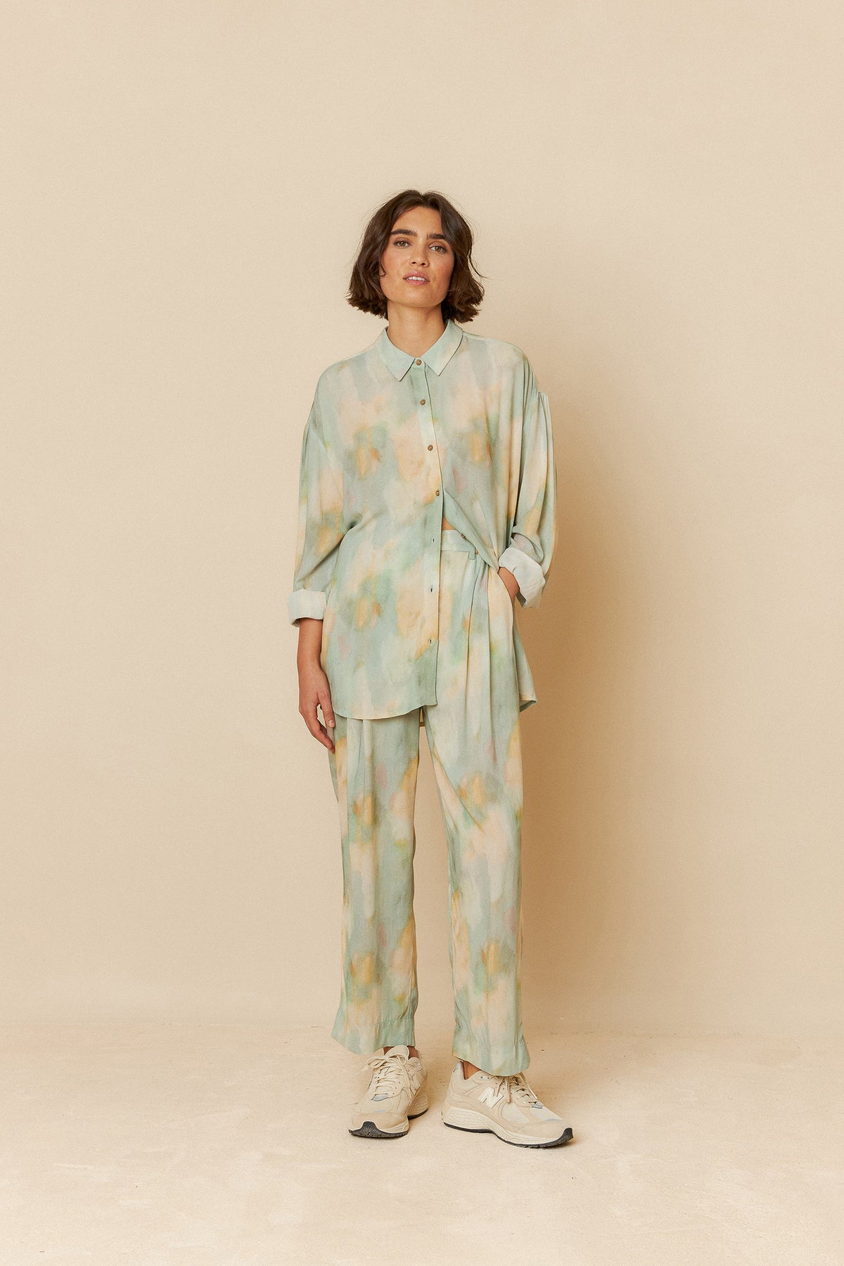 Effortless, oversized and beautifully printed — this Indi & Cold blouse is crafted from 100% sustainable viscose with a soft, flowing feel. The relaxed boyfriend silhouette features dropped shoulders and long sleeve cuffs, designed for a looser, more comfortable fit. Adorned with a vibrant digital watercolour maxi print, it adds a painterly touch to your everyday wardrobe. Perfect for layering or wearing on its own.