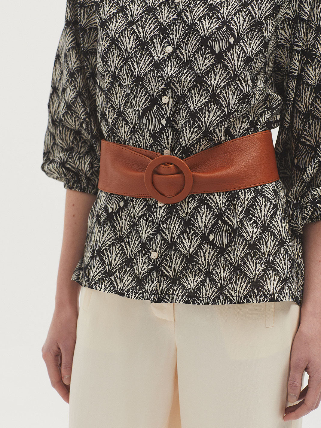 Leather belt with lined buckle. Measurements: 7.5 cm wide.