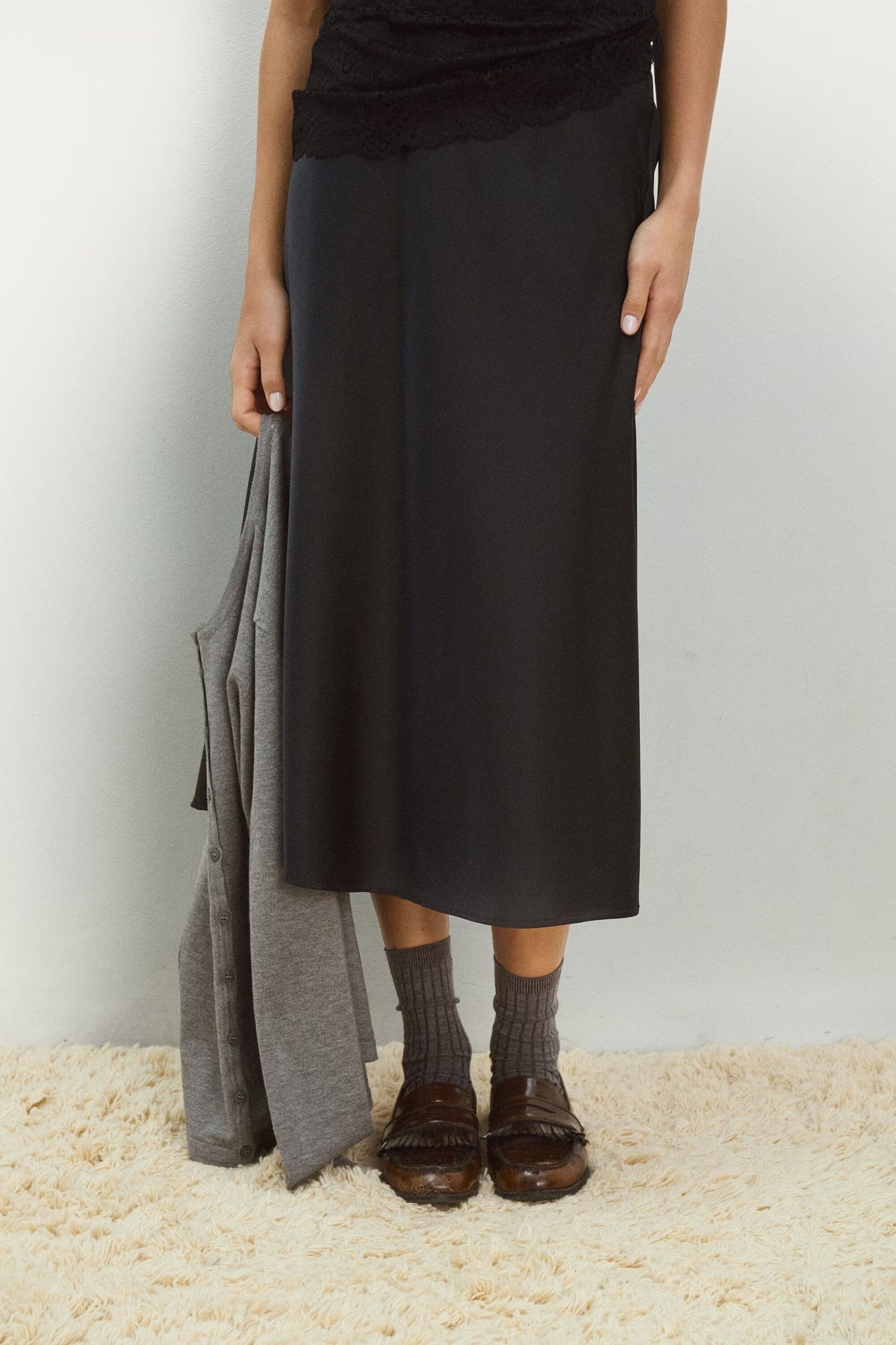 Midi skirt with a flattering A-line silhouette, designed for a relaxed fit and effortless style. Features a comfortable elastic waistband and smooth draping for versatile, everyday wear, perfect for various occasions.