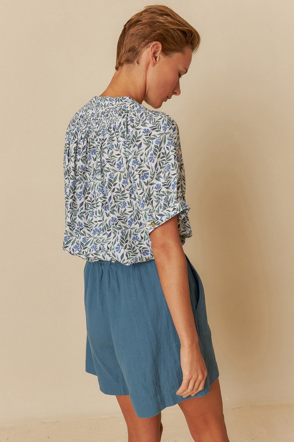 Soft, flowing, and effortlessly feminine, this Indi & Cold blouse is crafted from a sustainable 50/50 viscose blend with a texturised woven finish. Featuring a romantic digital watercolour floral print, it has short raglan sleeves with pleats, and smock yoke detailing at the front and back. Designed with a relaxed, slightly loose fit and a flared silhouette, it drapes beautifully for an easy, everyday look.