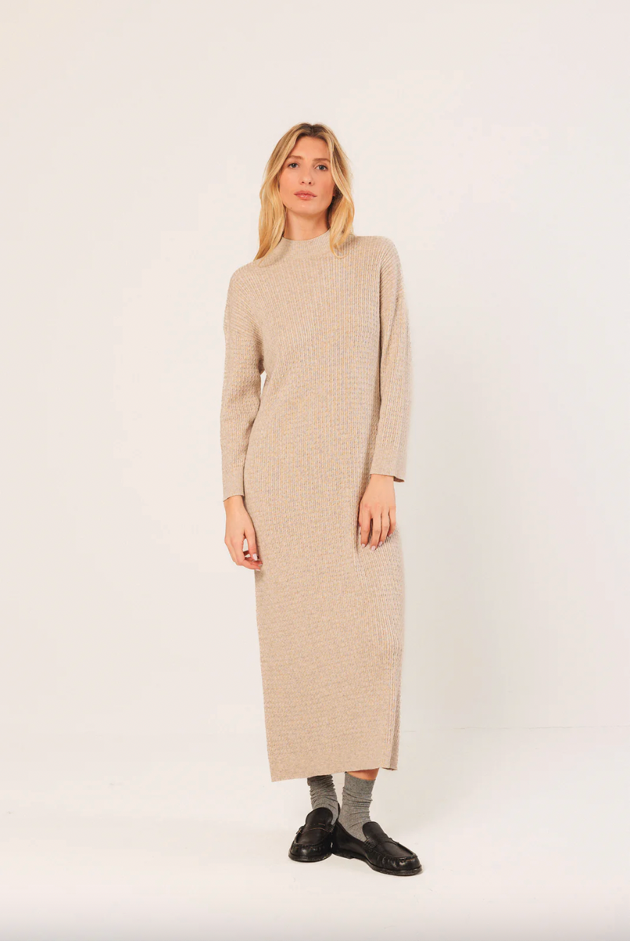 AW26 - Understated and effortlessly elegant, this Indi & Cold knit dress is crafted from a luxurious blend of sustainable cotton, responsible wool, and silk. Featuring dropped shoulders and a refined Perkins collar, it offers a clean, minimal silhouette with no pockets or slits for a smooth finish. Soft to the touch and designed for a relaxed fit, it drapes beautifully for easy, everyday sophistication.