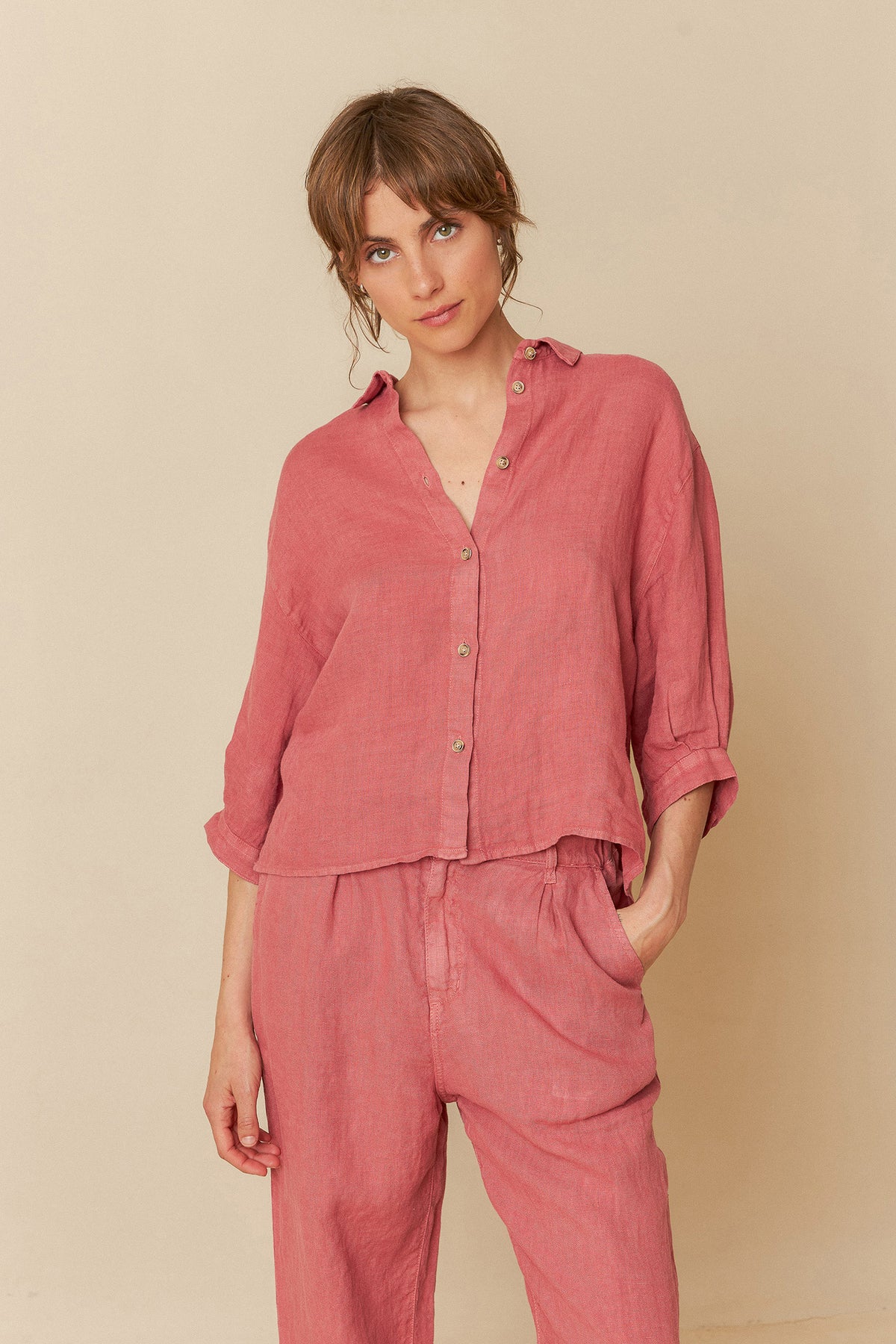 Light, breezy, this Indi & Cold shirt is crafted from 100% linen woven fabric. Designed with slightly dropped shoulders and 3/4 balloon sleeves with cuffs and button closures, it balances structure with ease. The slightly cropped front and side slits enhance its relaxed, boxy fit — wider and shorter for a contemporary, comfortable silhouette.
