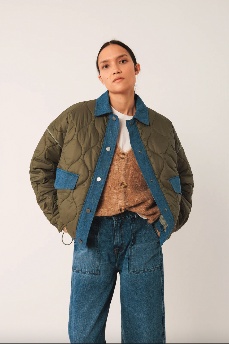 AW25 - This Indi & Cold quilted jacket is crafted from 100% polyester woven fabric for lightweight warmth and comfort. Designed with dropped shoulders and long sleeves with cuff snap closures, it features a snap front, piping pockets with decorative flaps, and an adjustable elastic waist inside for a flexible fit. Micro-corduroy or denim details at the collar, placket, and pocket flaps add a subtle textural contrast. Finished in a boxy, slightly cropped cut - wide, modern, and easy to layer.
