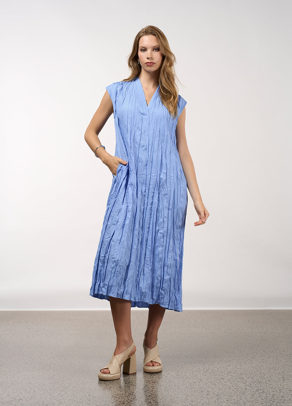 Midi length a-line dress with a deep V neckline in a permanent crinkle texture, with grown-on capped sleeves and an optional belt with top stitching detail.