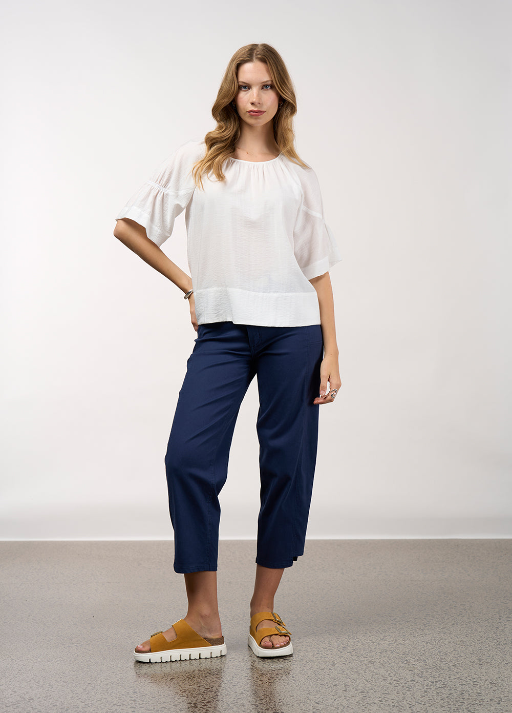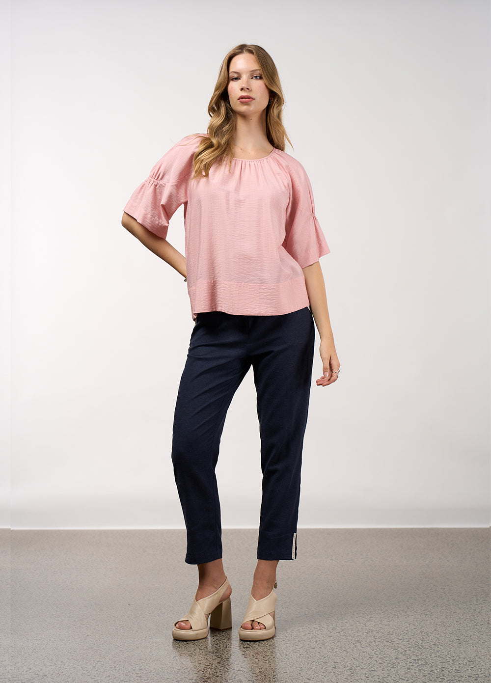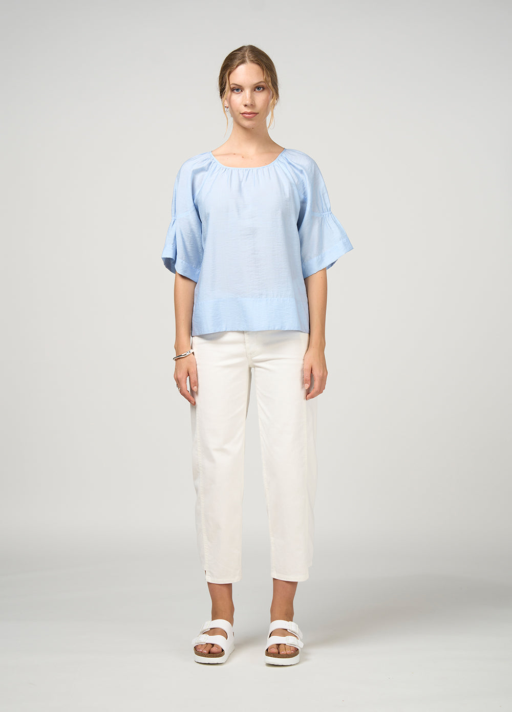 Relaxed fitting top with a softly gathered neckline and elasticated detail on the sleeves adding volume to the lower sleeve, with a deep hem.