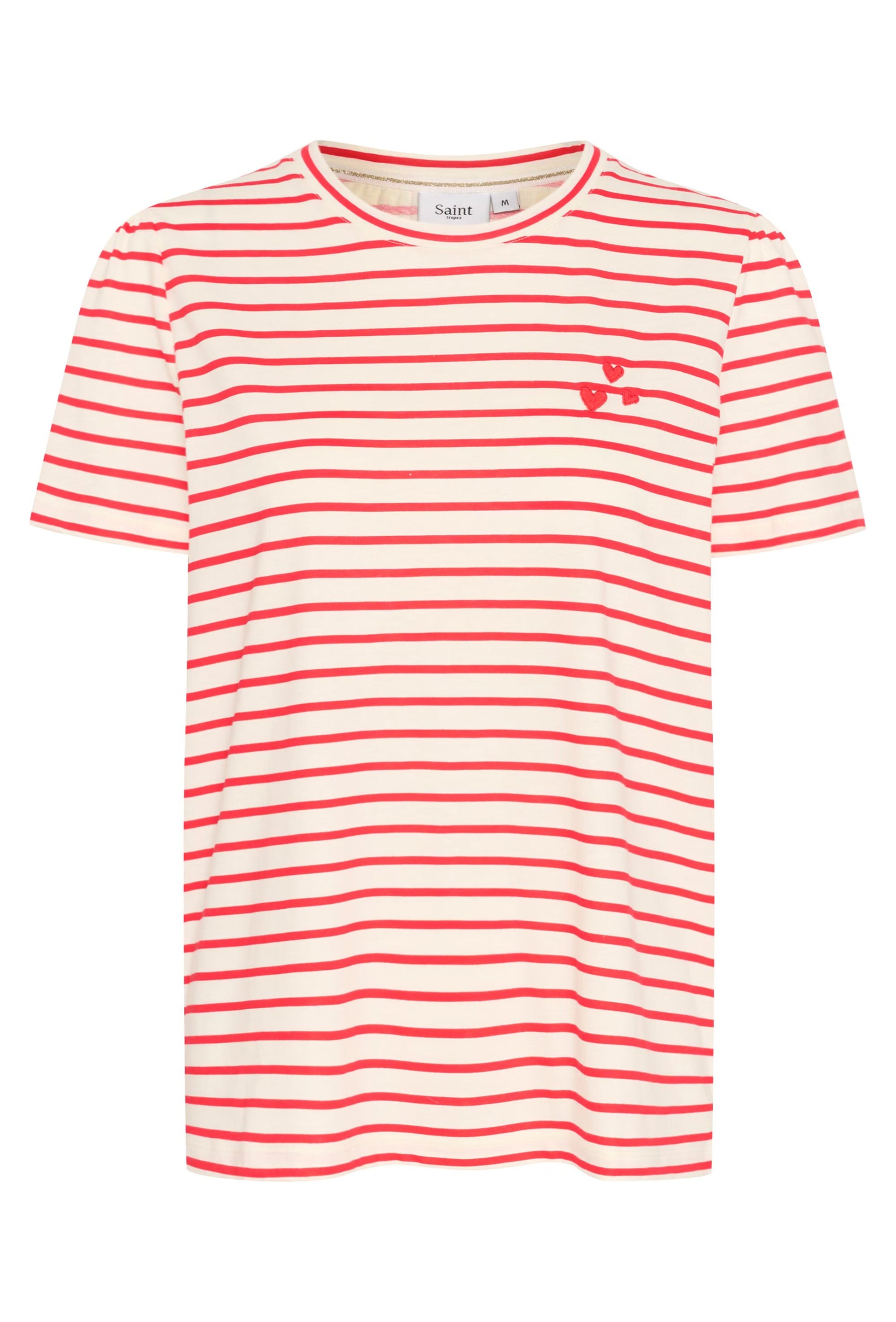 T-shirt in white with red horizontal stripes and a small chest print. Features a round neckline, short sleeves, and a straight fit. Made from soft jersey for everyday wear. The model is 175 cm tall and is wearing a size S.