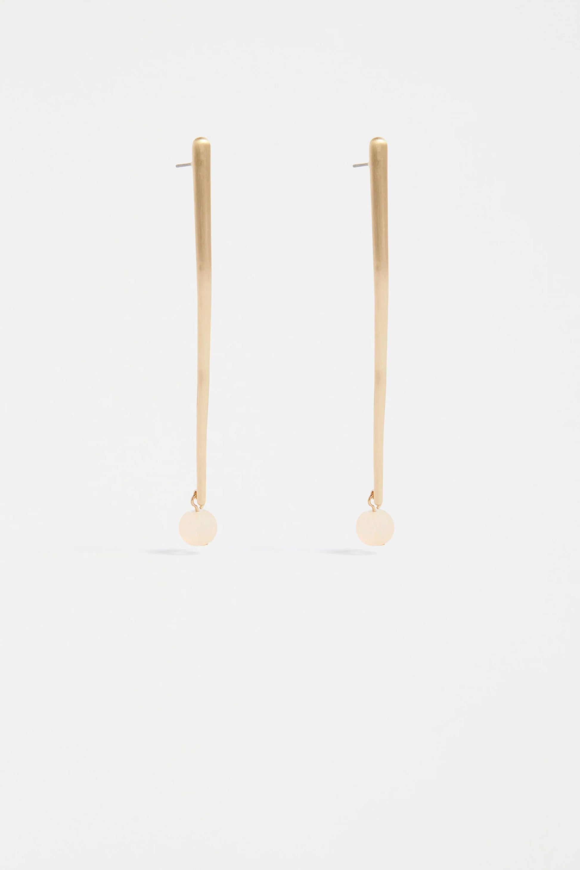 The Kyna Earring elevates your look with its sleek, long-drop design. A flat, tapered cylinder gracefully suspends a round bead, attached by a jump ring that allows it to move freely with every step. Lightweight and refined, this piece extends past the jawline to frame the face. Even with their elevated look, they still offer the simplicity of throw-on-and-go ease. Offered in three classic metals - Silver, Zinc, or Gold.