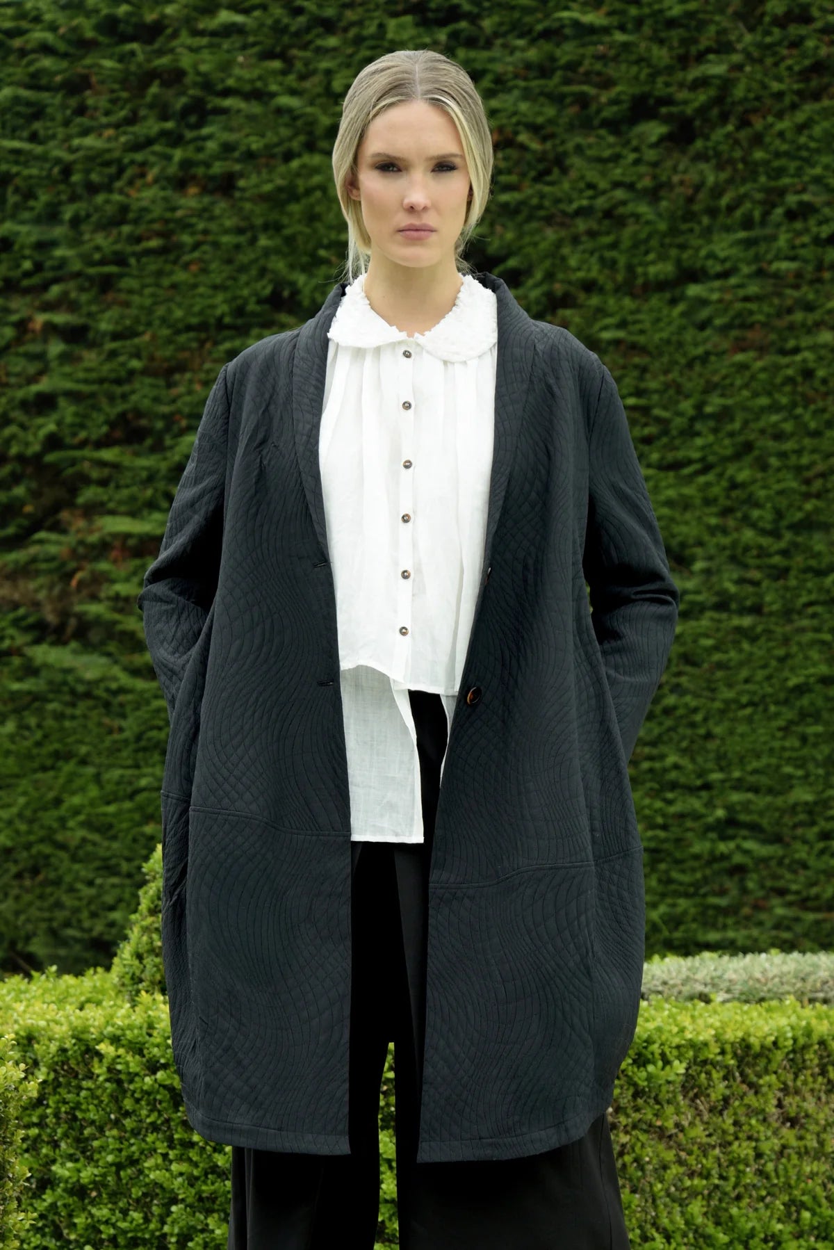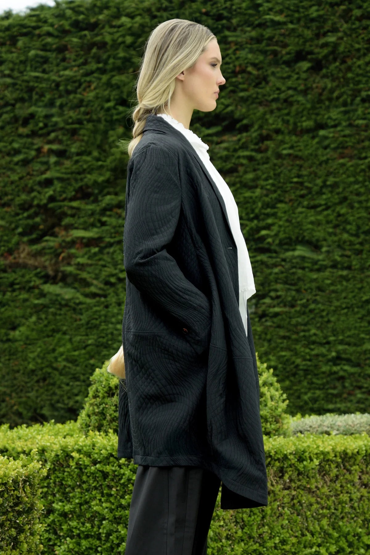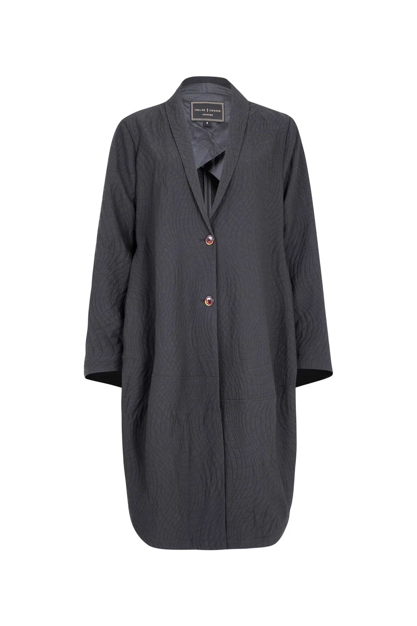 With day-to-day wear versatility the ‘Midnight Mantra’ coat sports a midweight feel making it a favourite for layering with your favourite Trelise Pieces. Crafted in the textured ‘Swirl the Night Away’ 3D jacquard this simple silhouette coat offers a relaxed, oversized fit complete with a curved hemline and shawl collar.