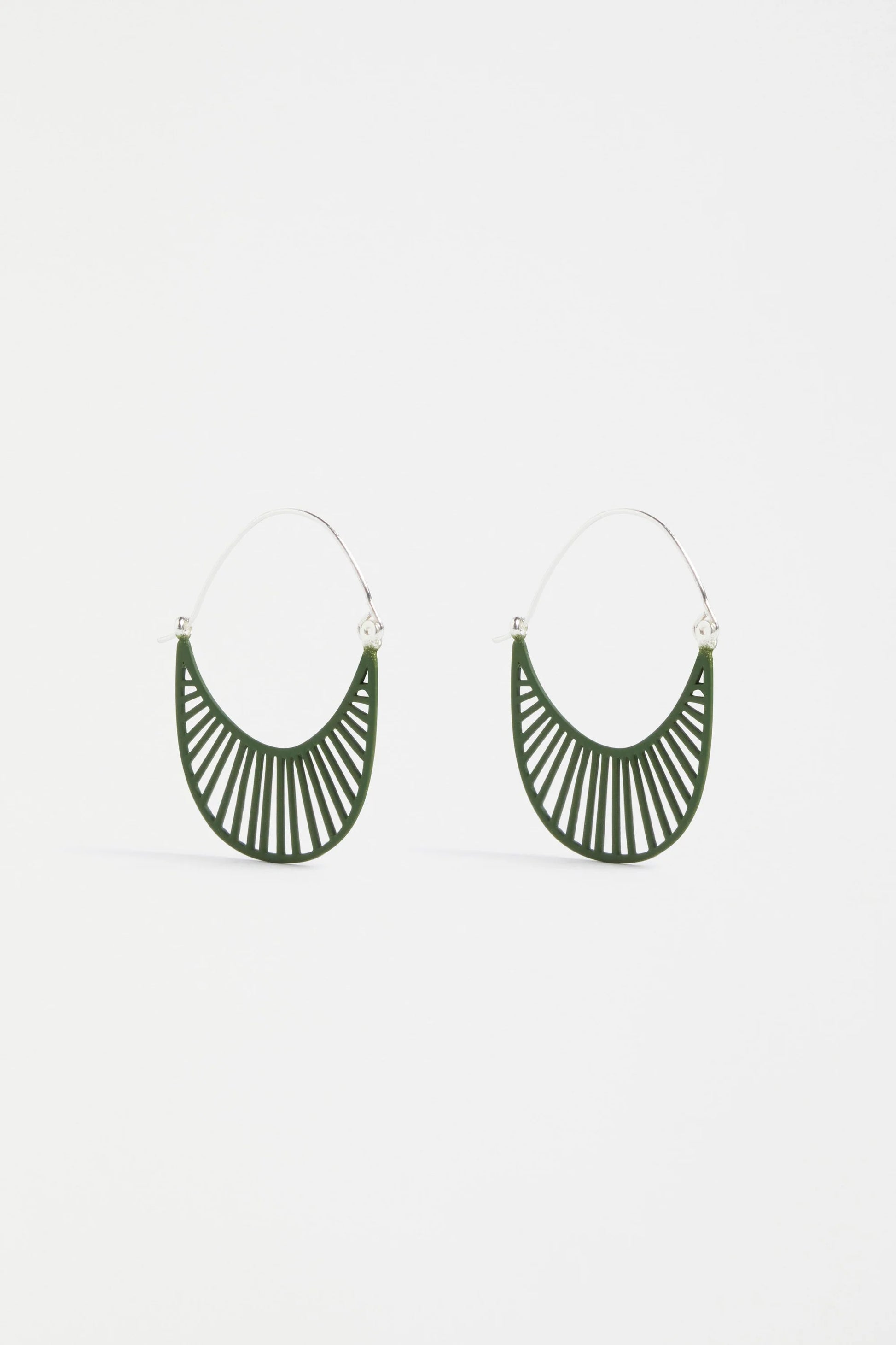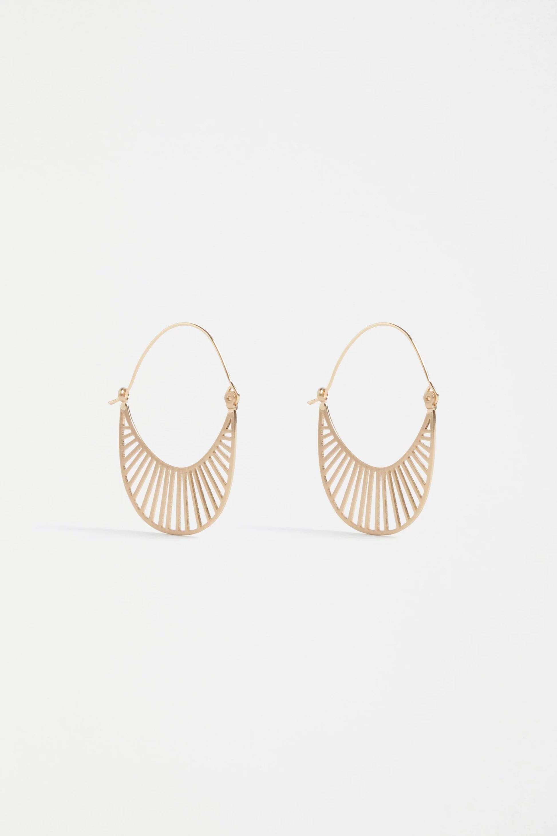 A small yet striking hoop with a sun-ray cut-out design. The Solsken Small Hoop offers subtle texture and shine with every turn, this lightweight style is perfect for adding an effortless touch of character. With its hinged backing, it's an easy-to-wear daily piece that doesn’t require second thoughts. Just slip them on and go. Crafted in classic Gold, Silver, or Green Moss.